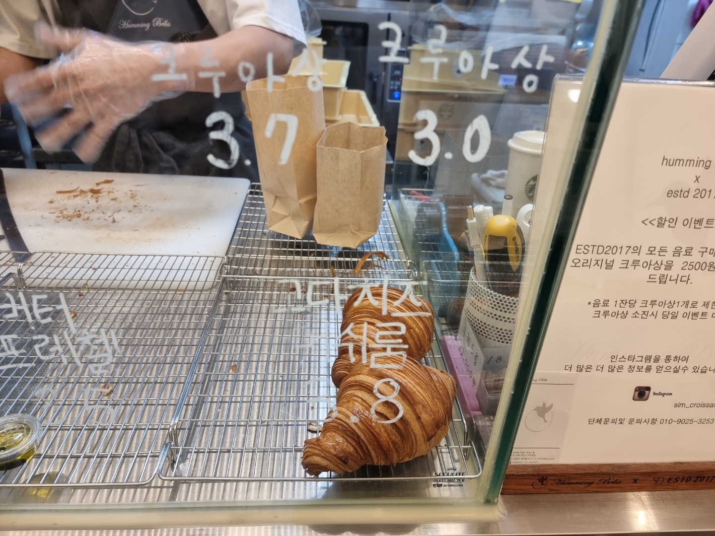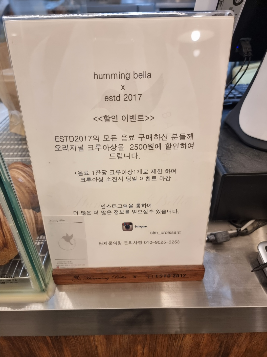 꿀팁으로 허밍벨라 바로 옆에 카페가 있는데 옆집에서 음료를 구매하면 크루아상을 할인해준다는 것 같다.