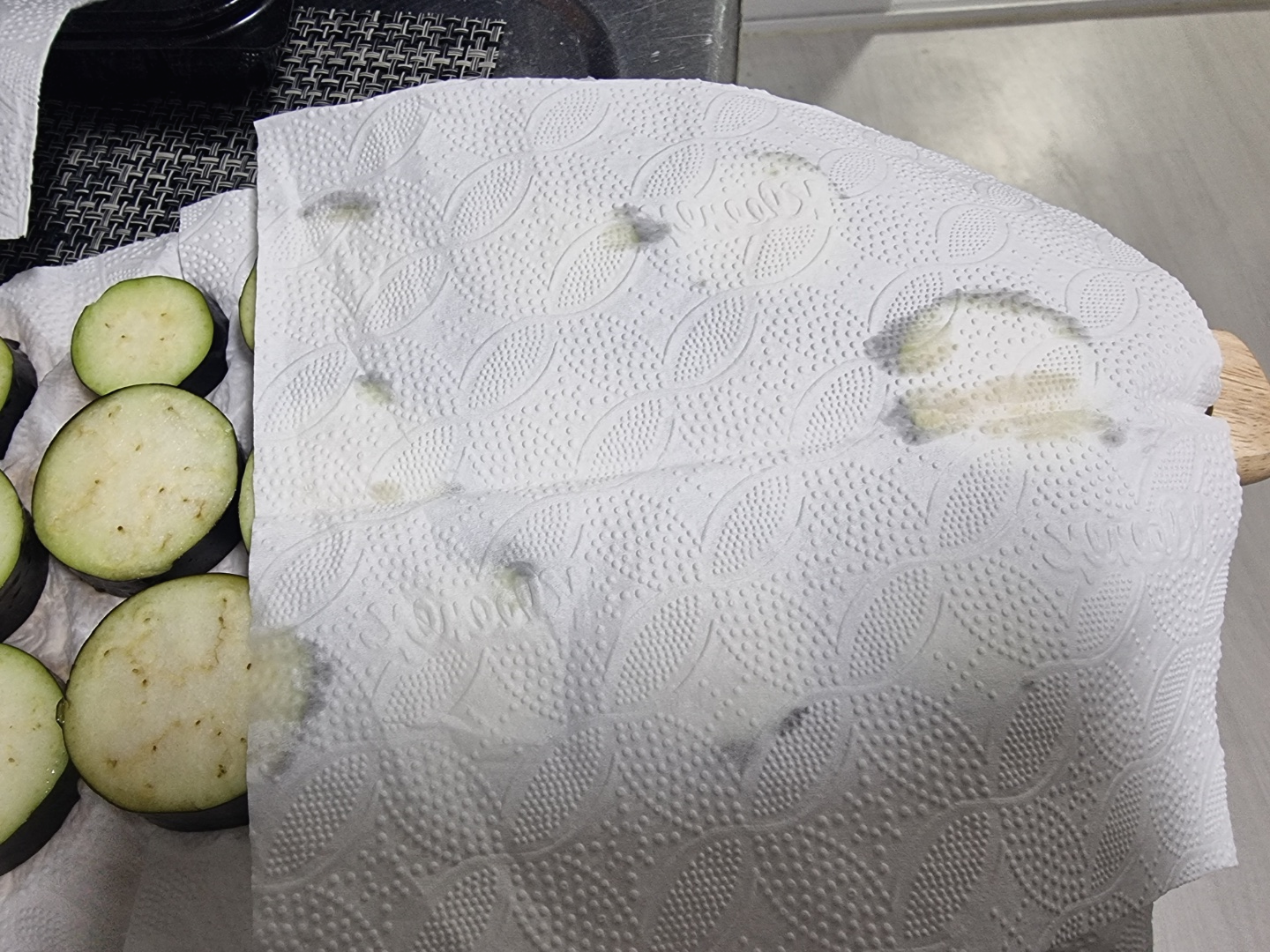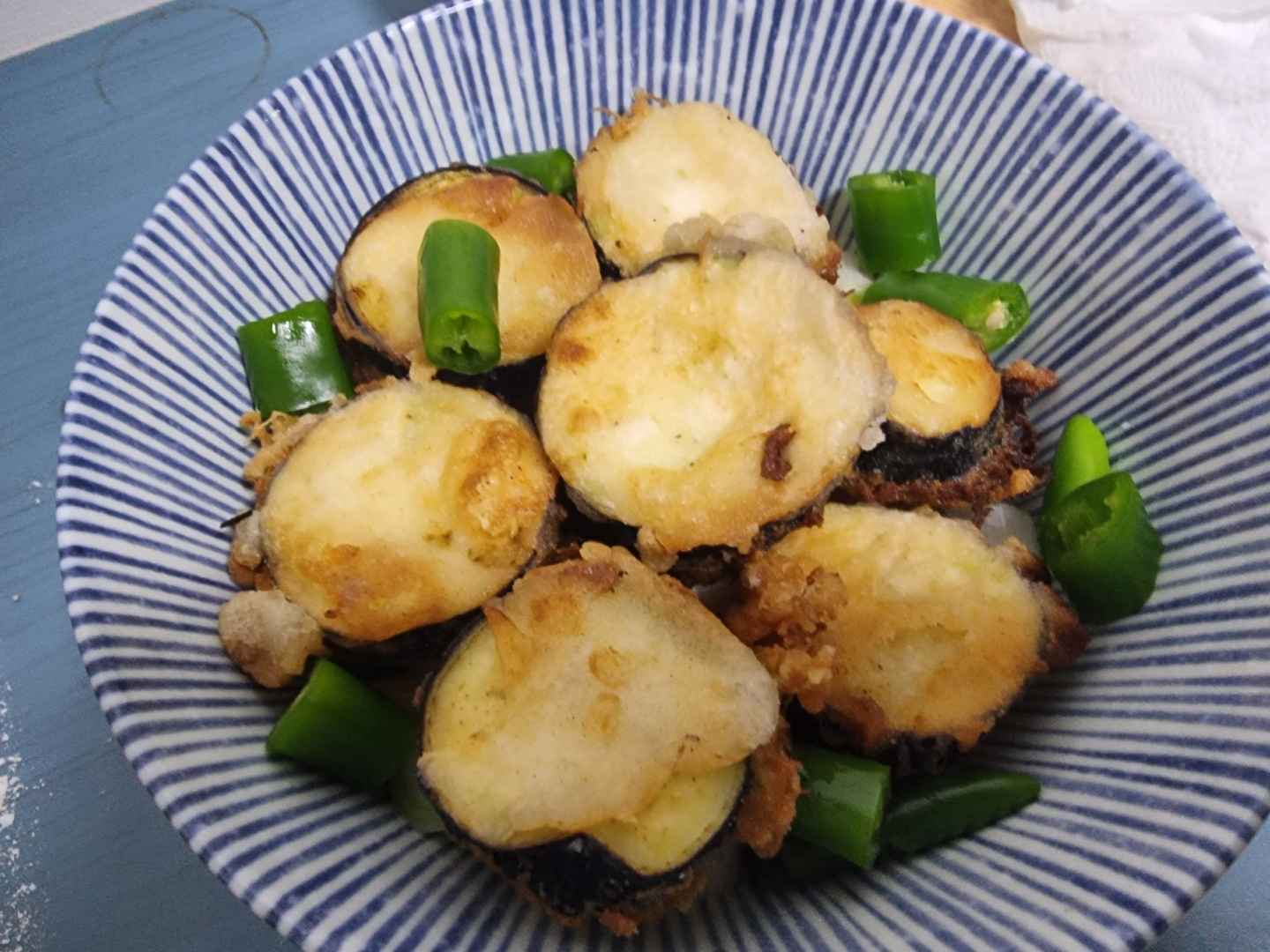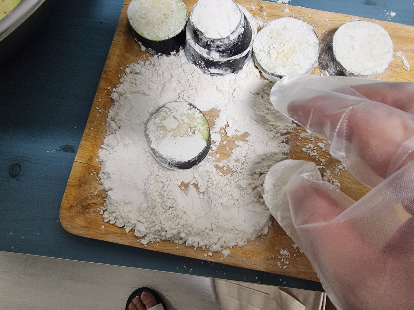5. 물에 담가뒀던 가지를 건져서 물기를 말려주고, 튀김가루를 얇게 펴발라줍니다.