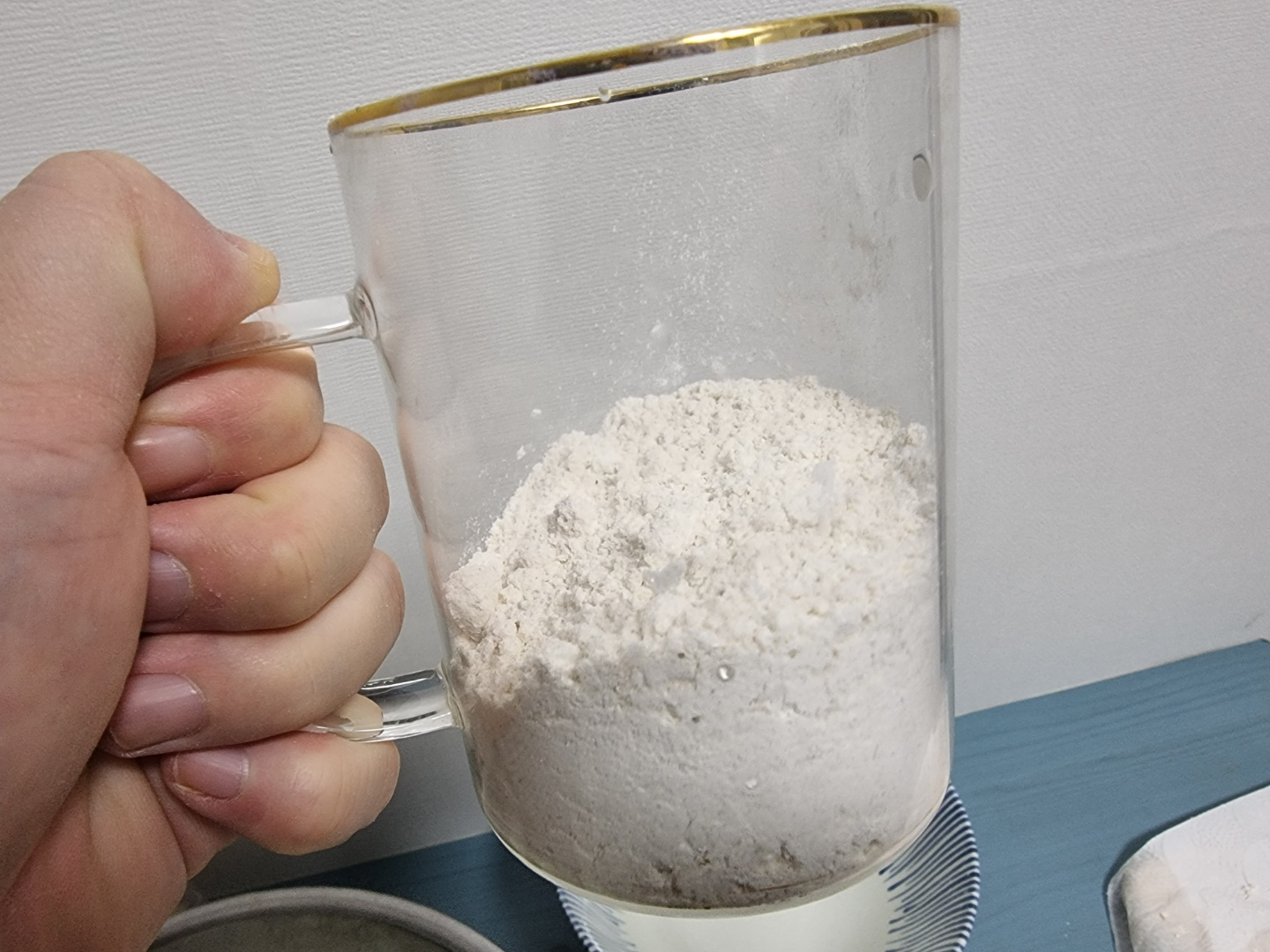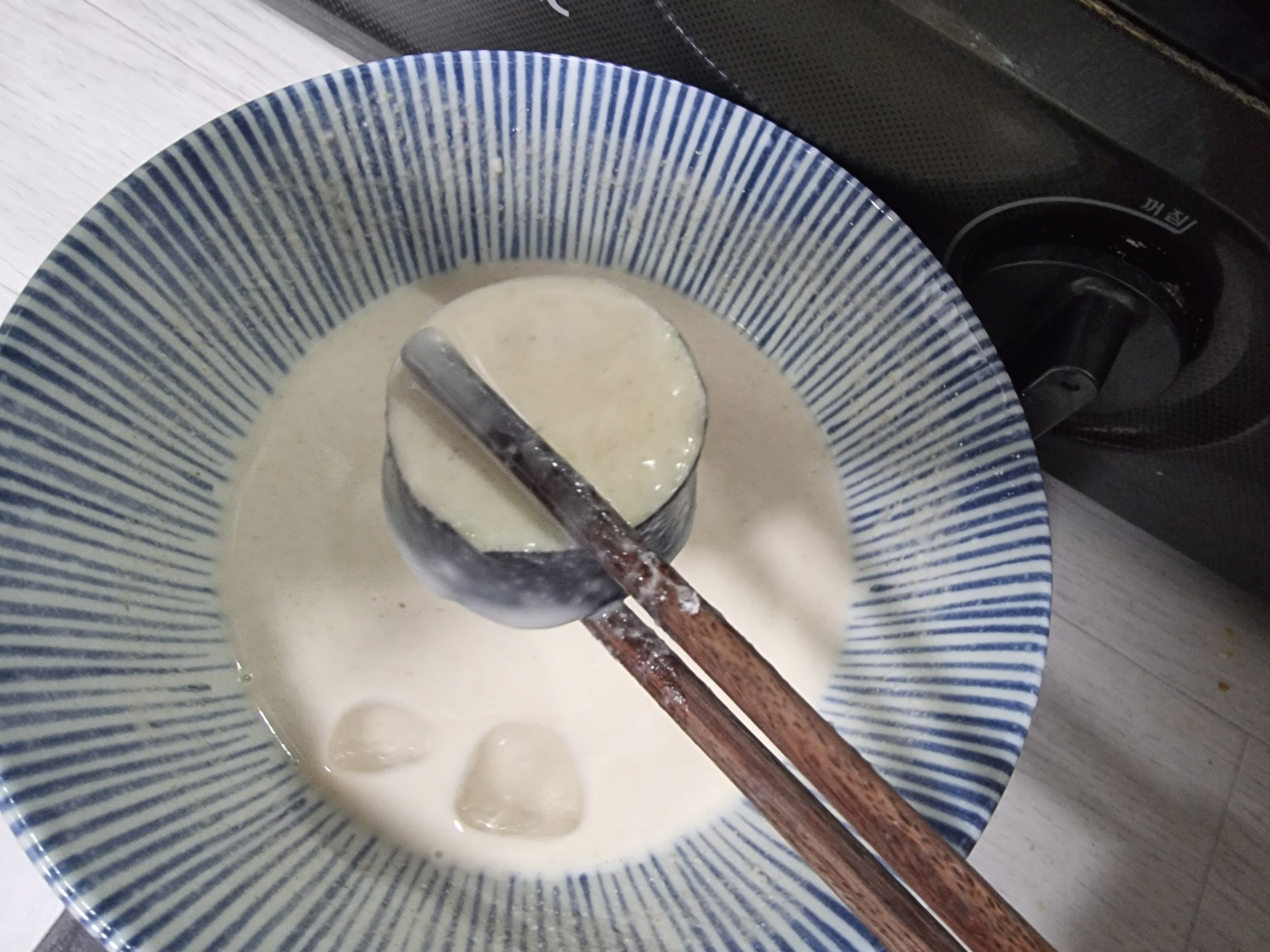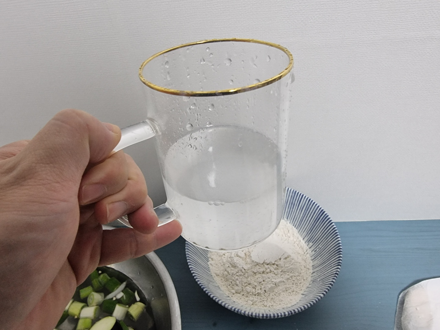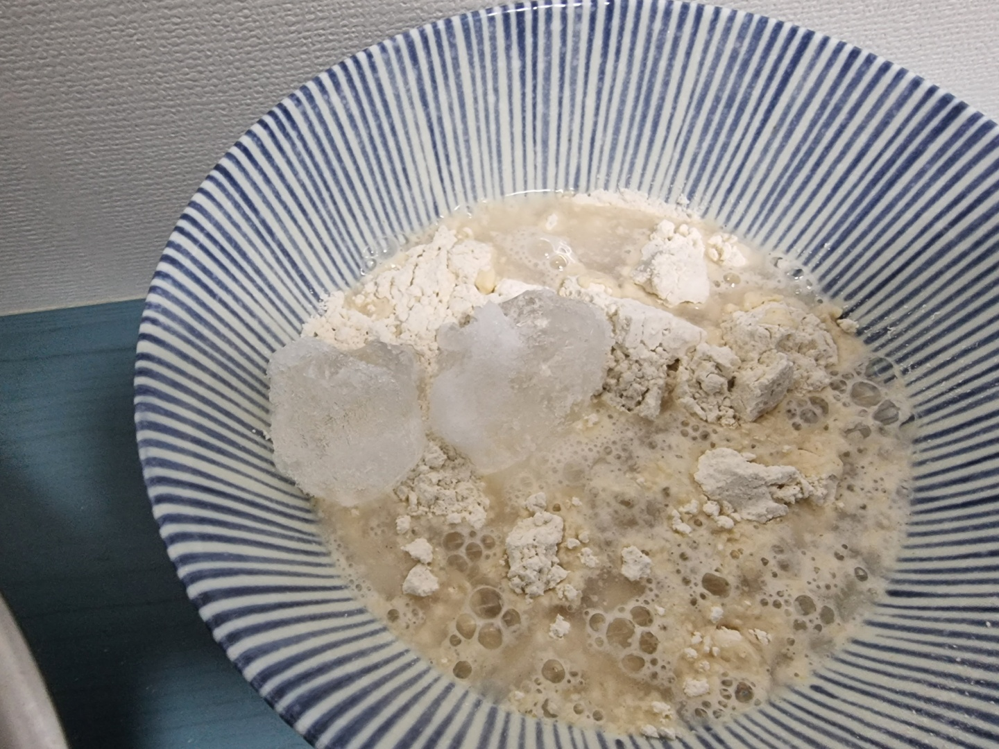 - 튀김가루 100ml (약 물 반컵), 정수물 80ml, 얼음 2알