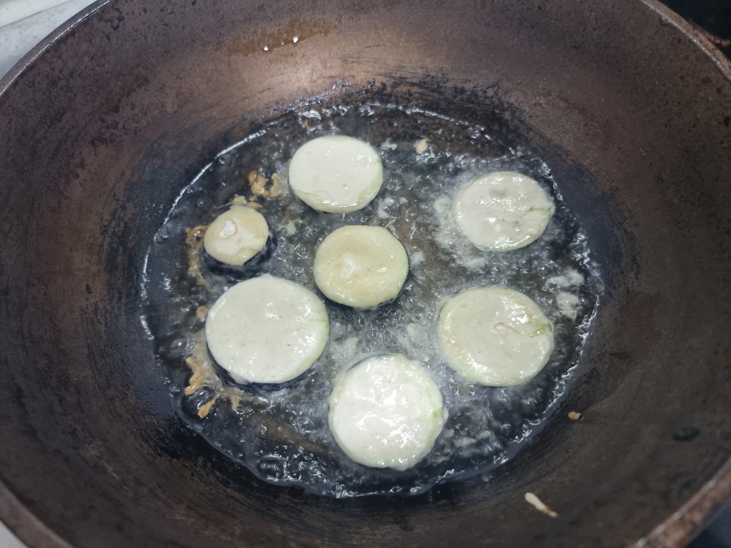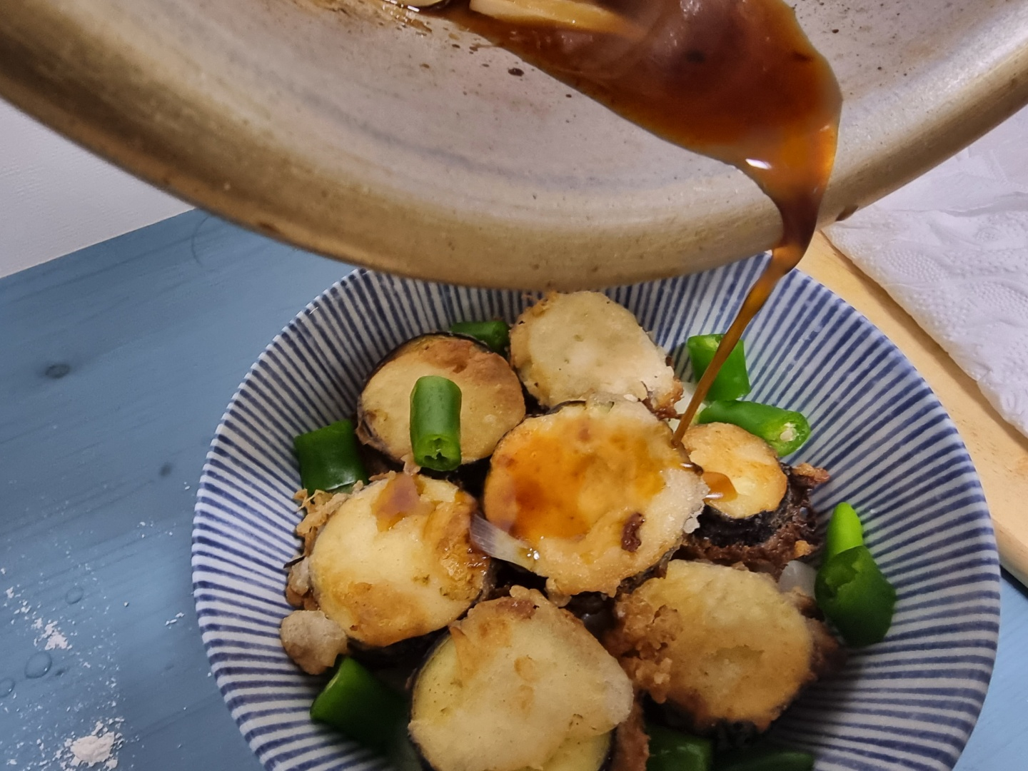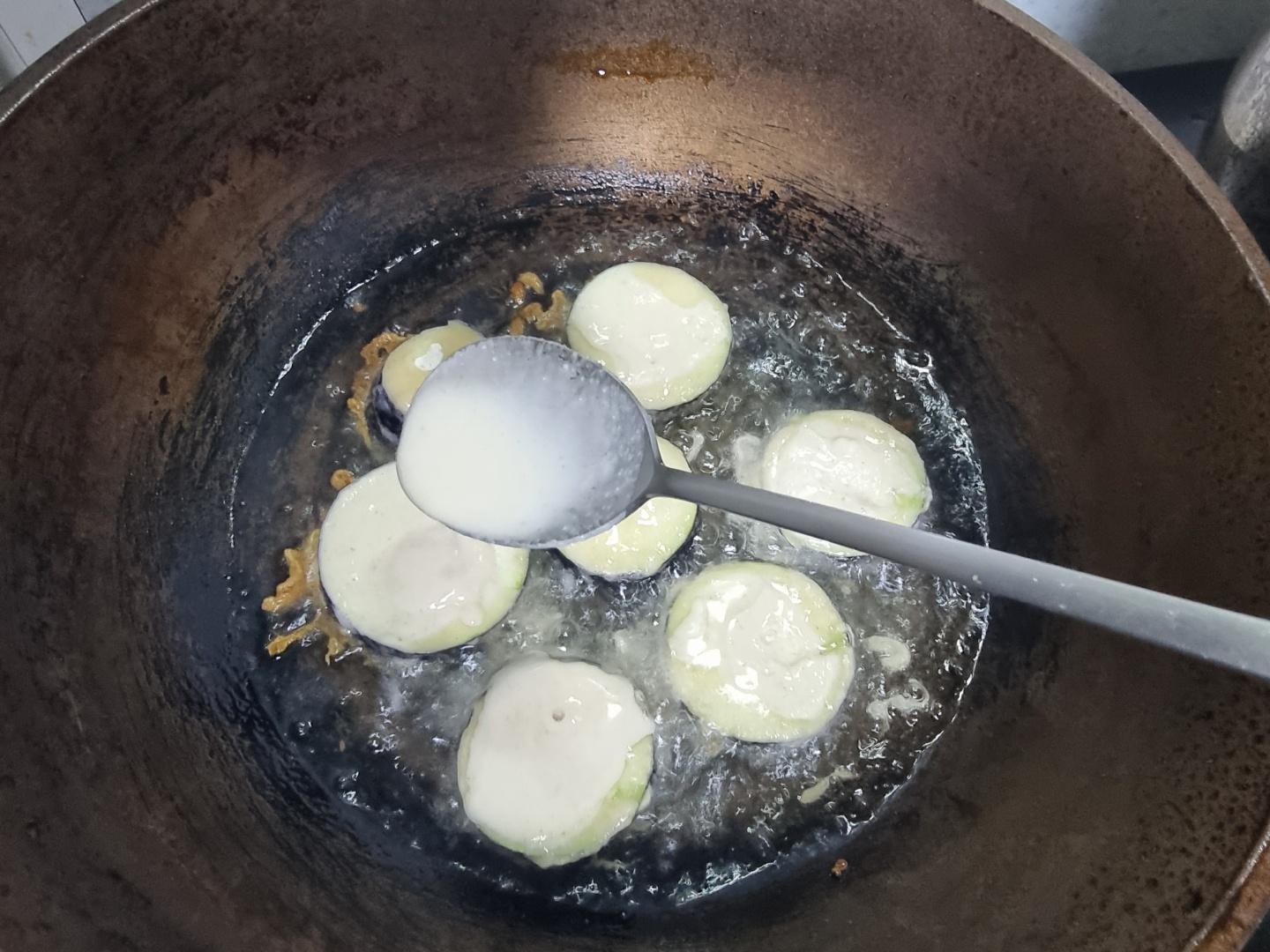 8. 가지를 튀김옷을 입혀 강불에 빠르게 튀겨줍니다.
