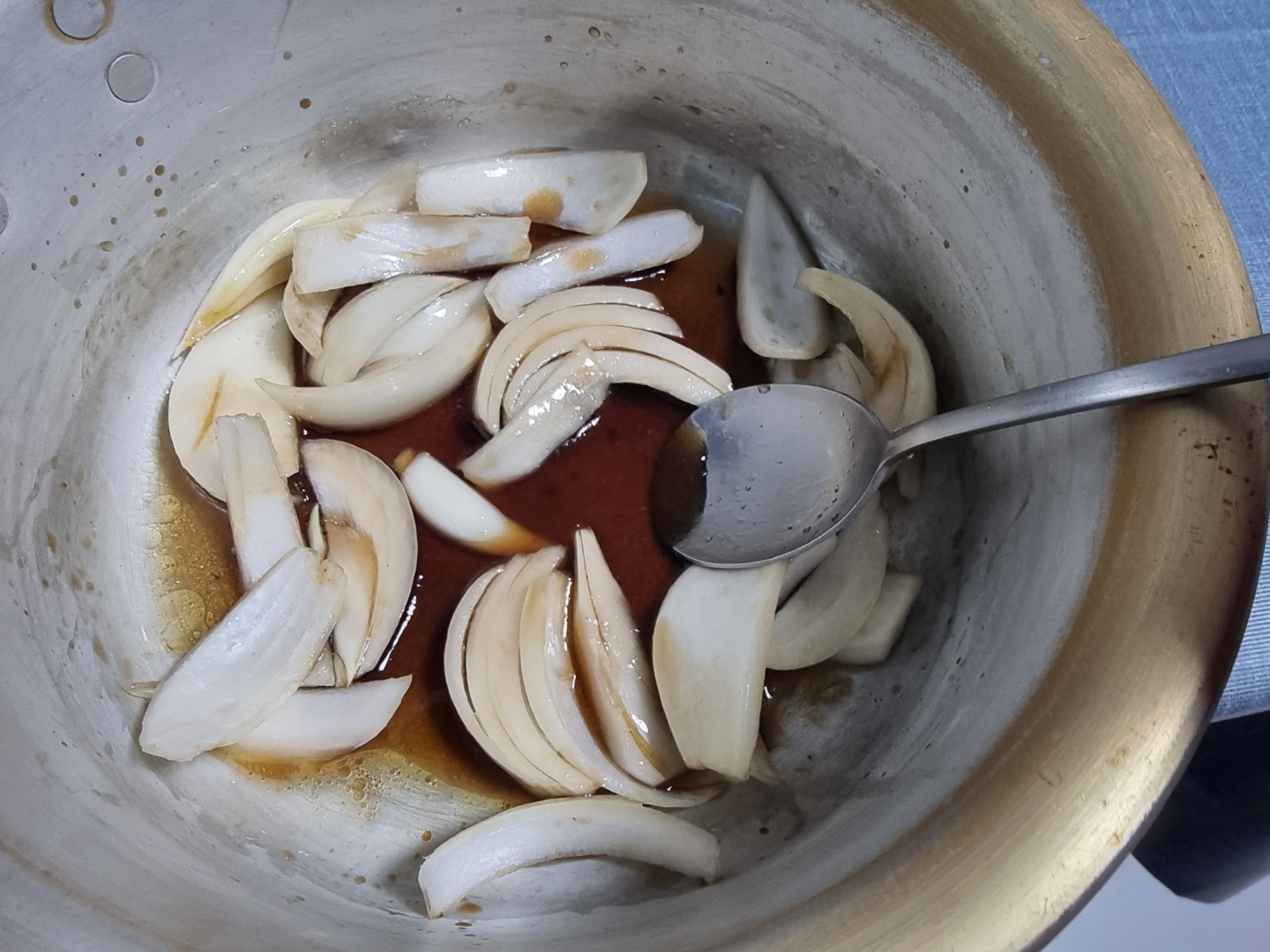 4. 손질해둔 양파를 소스에 넣고 강불에 1분간 볶아줍니다. (부먹 소스입니다)