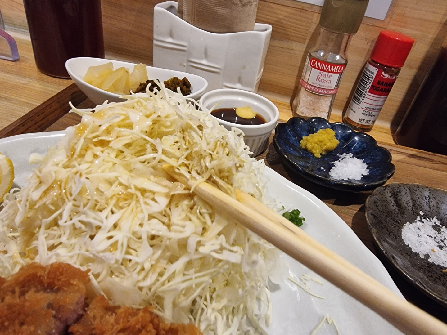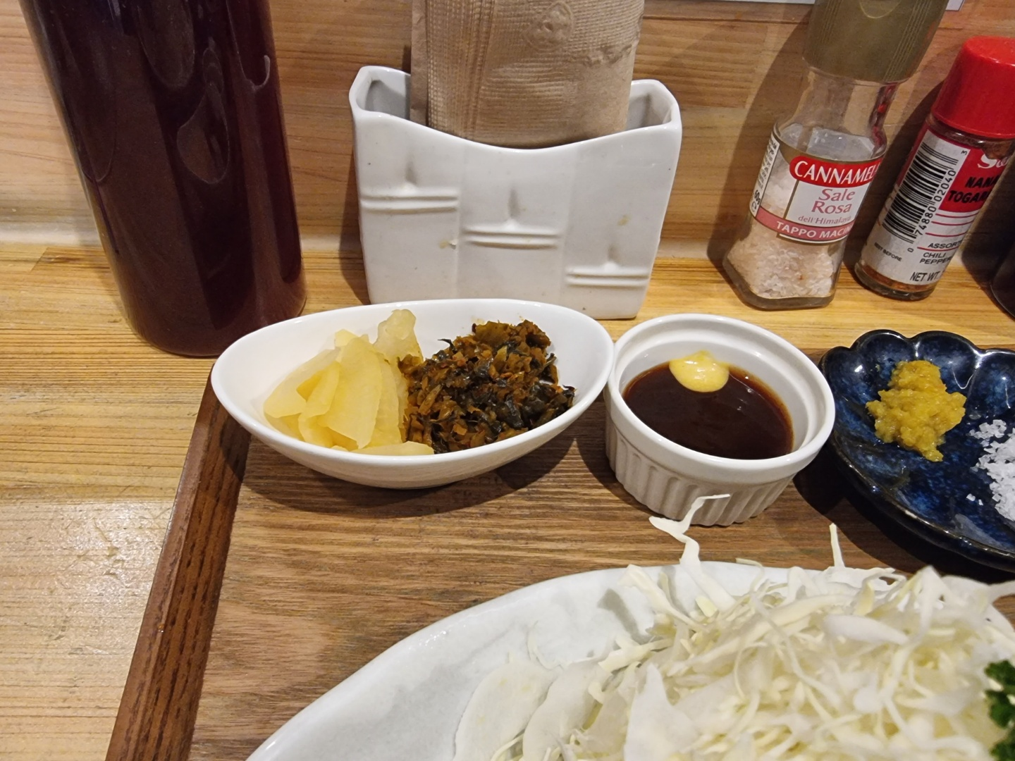 소스는 돈까스소스와 소금, 그리고 특이하게 유즈코쇼(유자향 고추소스)가 있다.