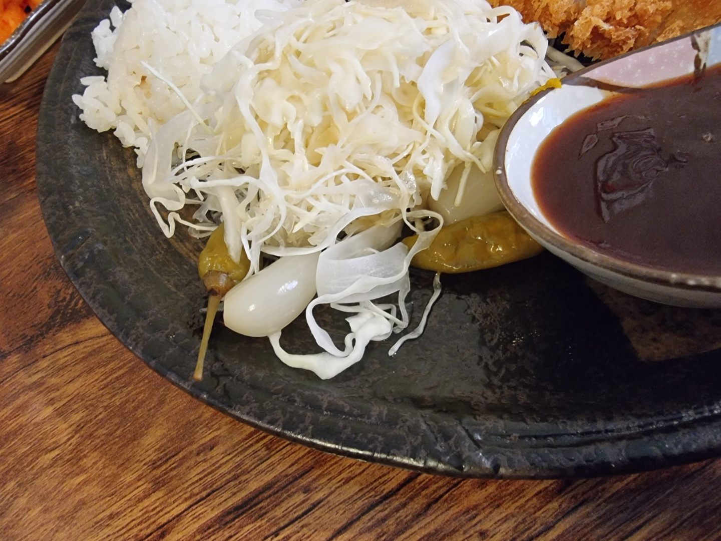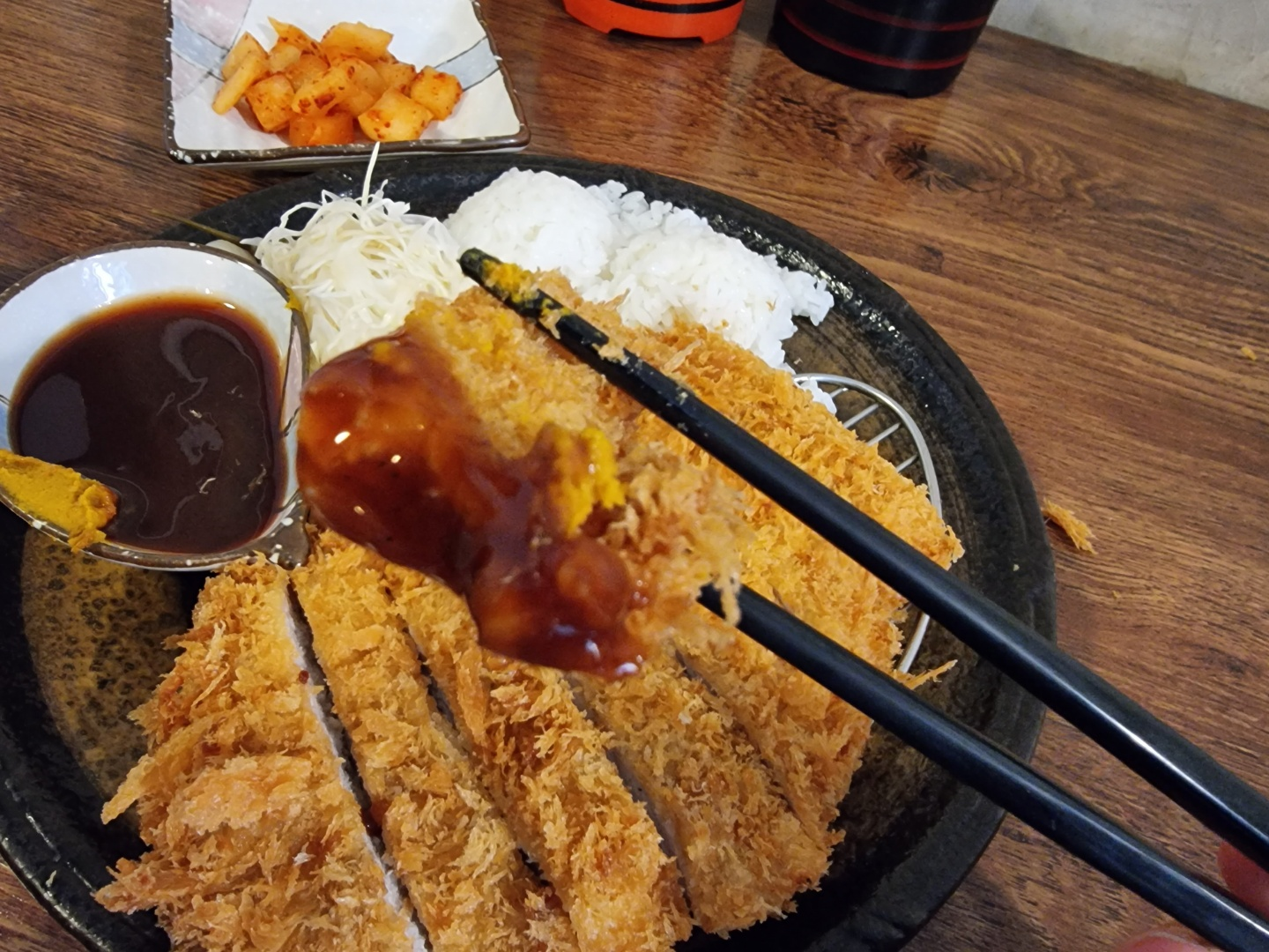 로스까스를 주문하면 이렇게 나오고 소스는 돈까스 소스와 겨자소스만 제공된다.특이하게 밥이 2덩이가 제공된다.