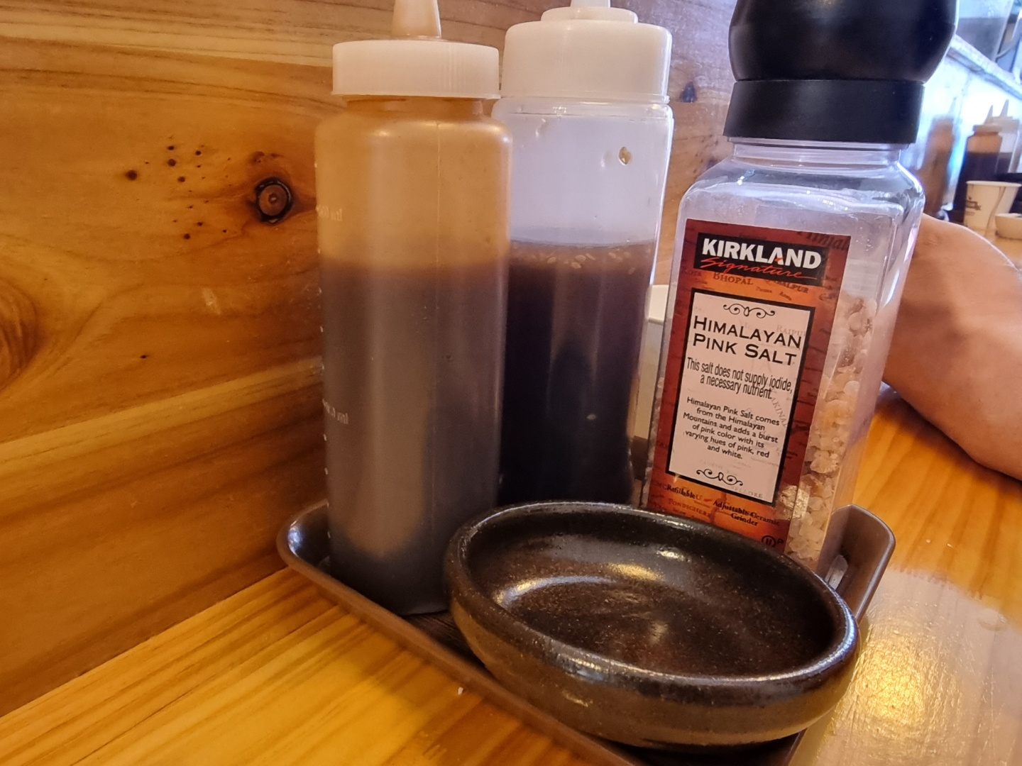 소스로는 돈까스 소스, 히말라야 솔트, 후추, 겨자가 있다.
