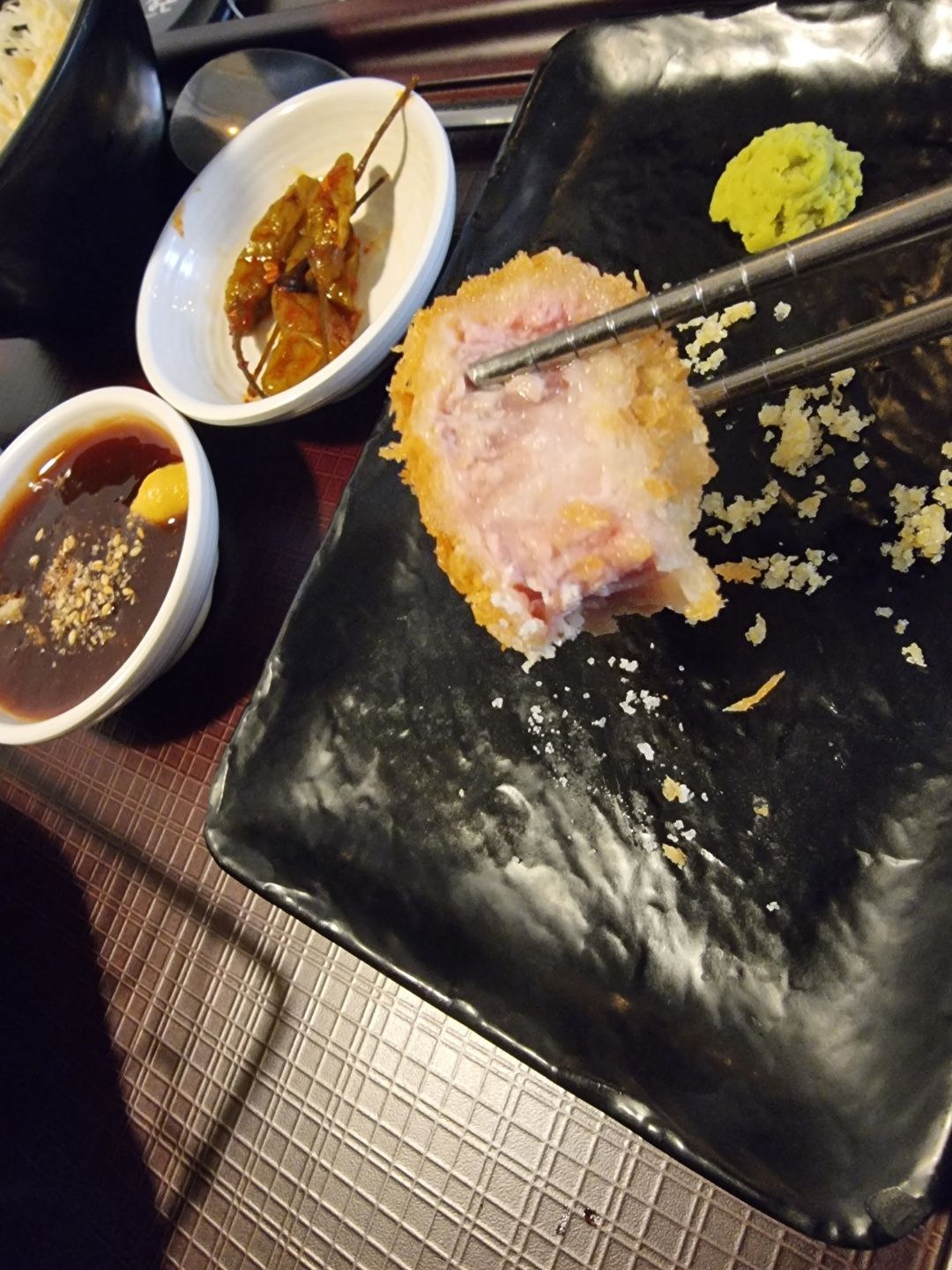 여기는 트러플 소금, 레몬소금, 와사비, 돈까스소스가 주어지는데