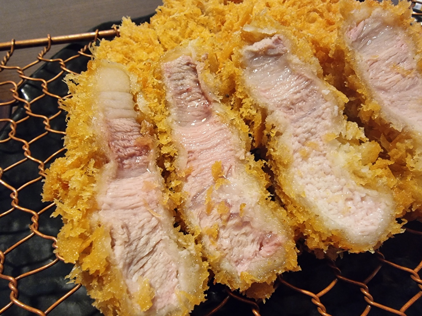 선홍빛을 도는 고기에 육즙도 고여있고 황금색 튀김옷의 3박자.